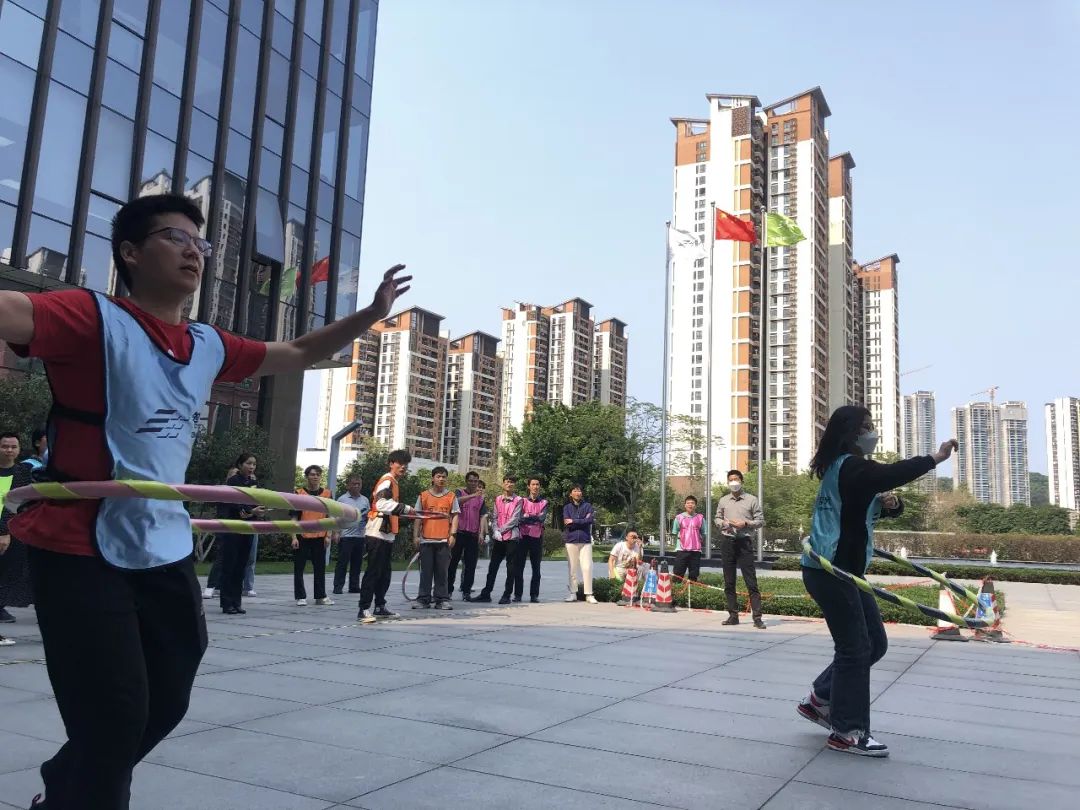 趣味運(yùn)動會的最后一個游戲環(huán)節(jié),每組派出4名選手,轉(zhuǎn)動呼啦圈進(jìn)行接力往返,在呼啦圈不落地的情況下,用時短組獲勝。
